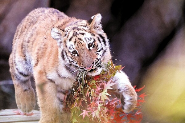 과천 서울대공원 동물원에서 시베리아 아기 호랑이 ‘설호’가 나뭇잎을 가지고 놀고 있다. 설호는 순수 혈통 시베리아 호랑이(암컷)로, 현충일인 6월 6일 태어났다. 아빠 호랑이 ‘로스토프’와 엄마 ‘펜자’는 2010년 러시아 야생에서 태어났으며, 한ㆍ러 수교 20주년 정상회담을 기념해 2011년 5월 22일 서울동물원에 이사 왔다./과천=연합뉴스